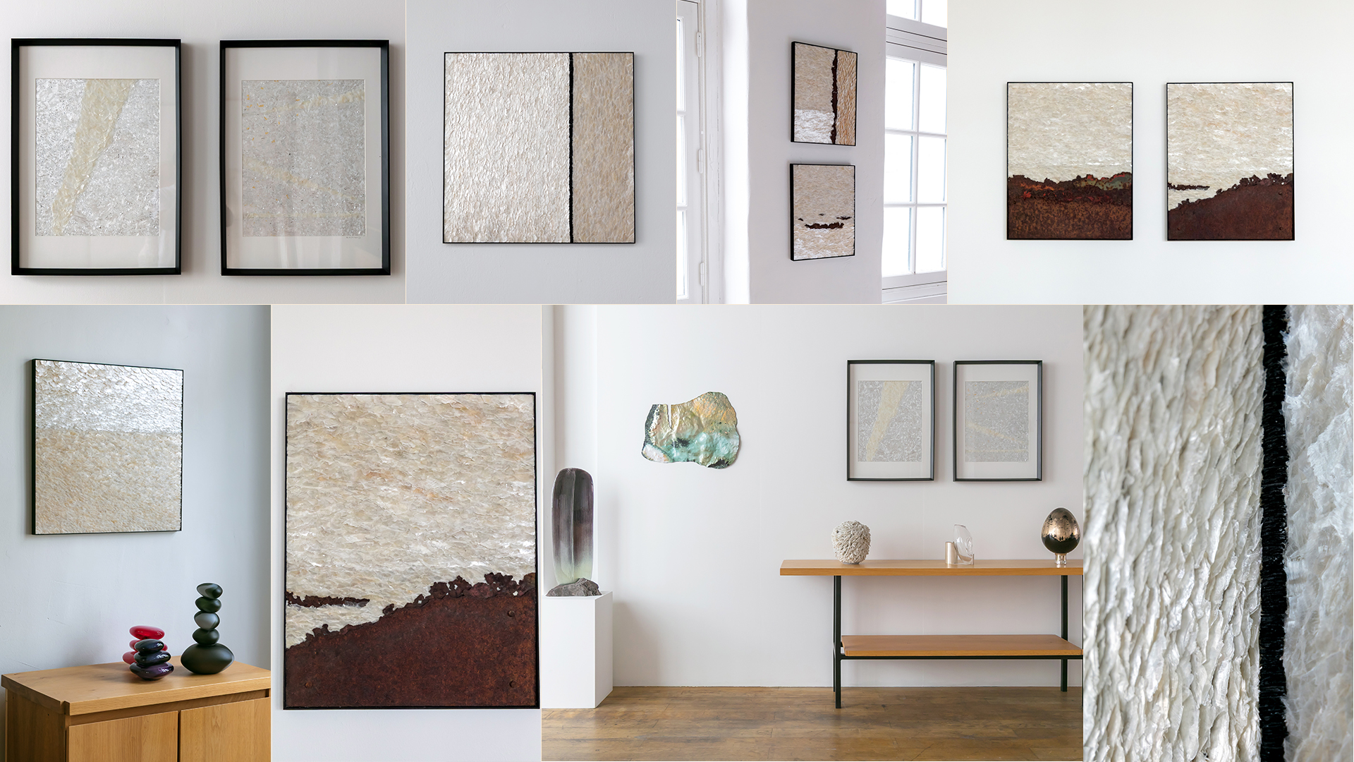 La mosaïste a exploré l’ardoise, et travaille aujourd’hui la nacre qu’elle allie parfois au métal, récupérant des surfaces altérées par le temps- tôles oxydées, fragments industriels – et les assemble et les superpose. Entre rouille, nacre et lumière, ses œuvres révèlent des paysages abstraits, où la matière se décompose, se transforme et capte le regard.